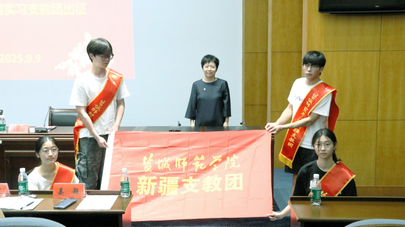 仪式上,毕凤珊为铁军支教团授旗,她勉励全体成员秉承“厚德、博学、求真、笃行”的盐师校训,以饱满的热情和专业的素养全身心投入工作,为新疆基础教育高质量发展贡献盐师智慧和力量。