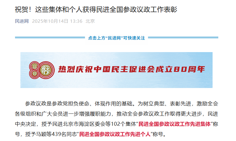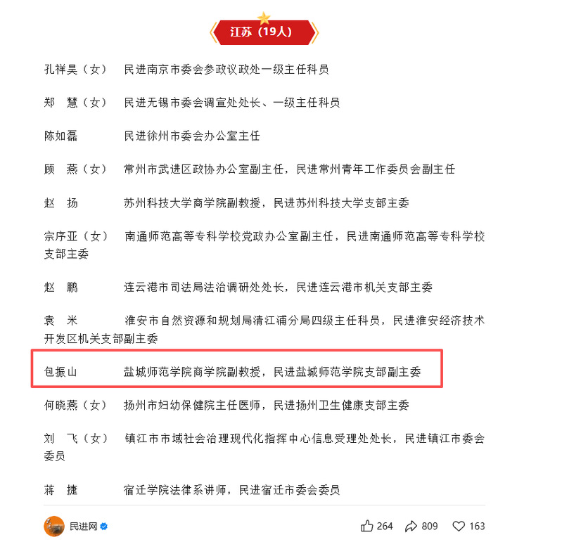 近日,庆祝中国民主促进会成立80周年暨民进全国参政议政工作会议在北京隆重举行,会议表彰了民进全国参政议政工作先进集体和先进个人。我校商学院教师包振山凭借其在参政议政领域的扎实工作与突出贡献,获评“民进全国参政议政工作先进个人”称号,该称号五年评一次,此次江苏省共有19人获此殊荣。