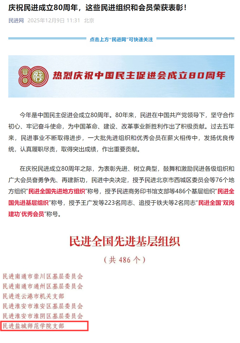 12月9日,庆祝民进成立80周年全国先进组织、优秀会员表彰大会在京召开,民进中央主席蔡达峰出席会议并讲话,民进中央副主席王刚在会上宣读了《民进中央关于表彰民进全国先进地方组织、 先进基层组织和“双岗建功”优秀会员的决定》,民进盐城师范学院支部荣获“民进全国先进基层组织”称号,是江苏省获此殊荣的7所高校之一。